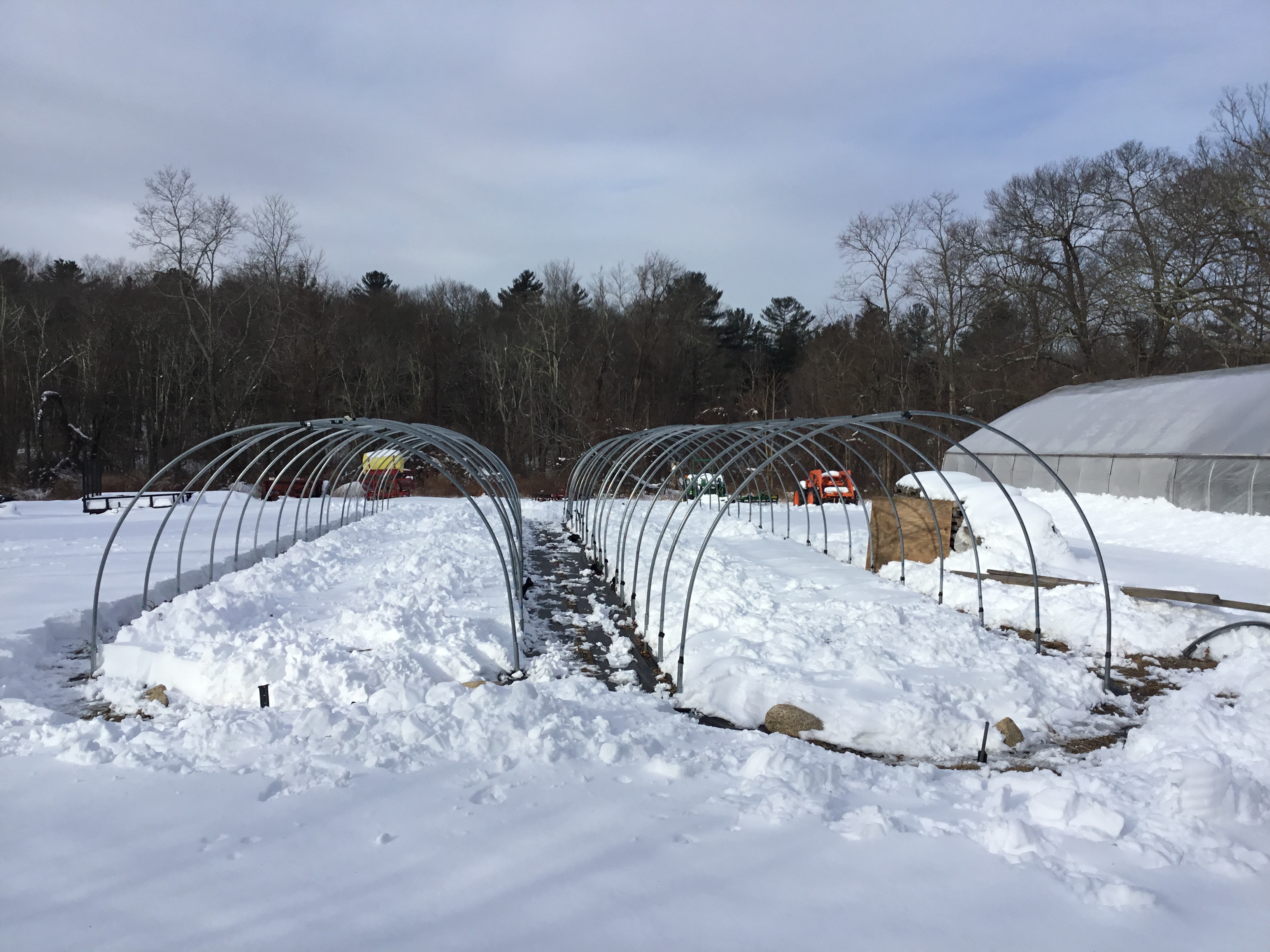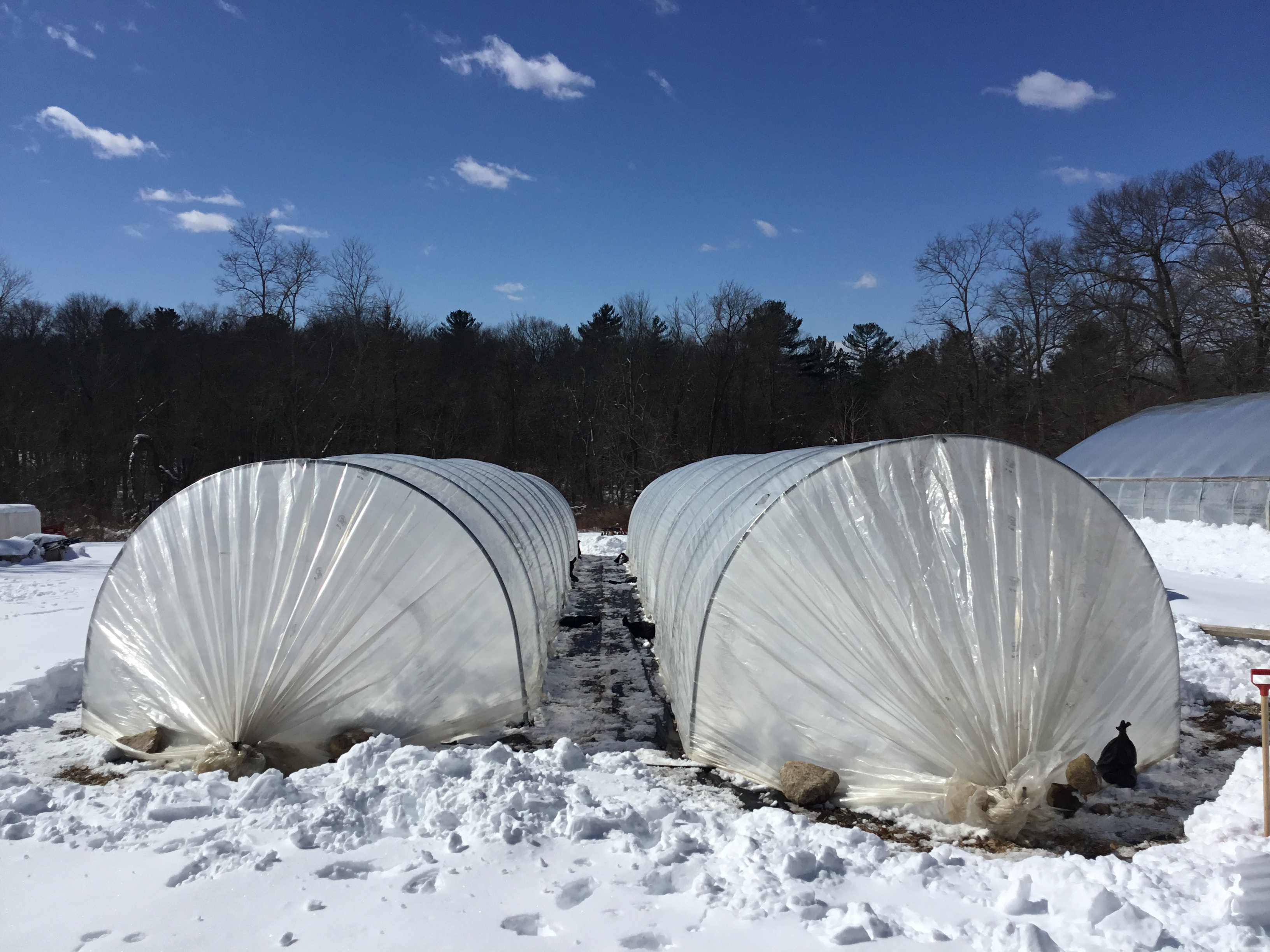 Our Tunnels are 12’x72′, with hoops spaced every 4′. Their rounded shape (refereed to as ‘quonset style’) is not sufficient to support the snow load of a typical New England winter, and their narrowness does not allow them to hold very much thermal energy, so we take the plastic off in winter, usually around Christmas, and put it back on the first week of March. This year, we let the heavy snow of early March fall before we covered: first, so we didn’t have to worry about the tunnels collapsing and second because we didn’t get much precipitation this winter, and it’s actually good for the soil to get a natural ‘flushing’ before being covered again.