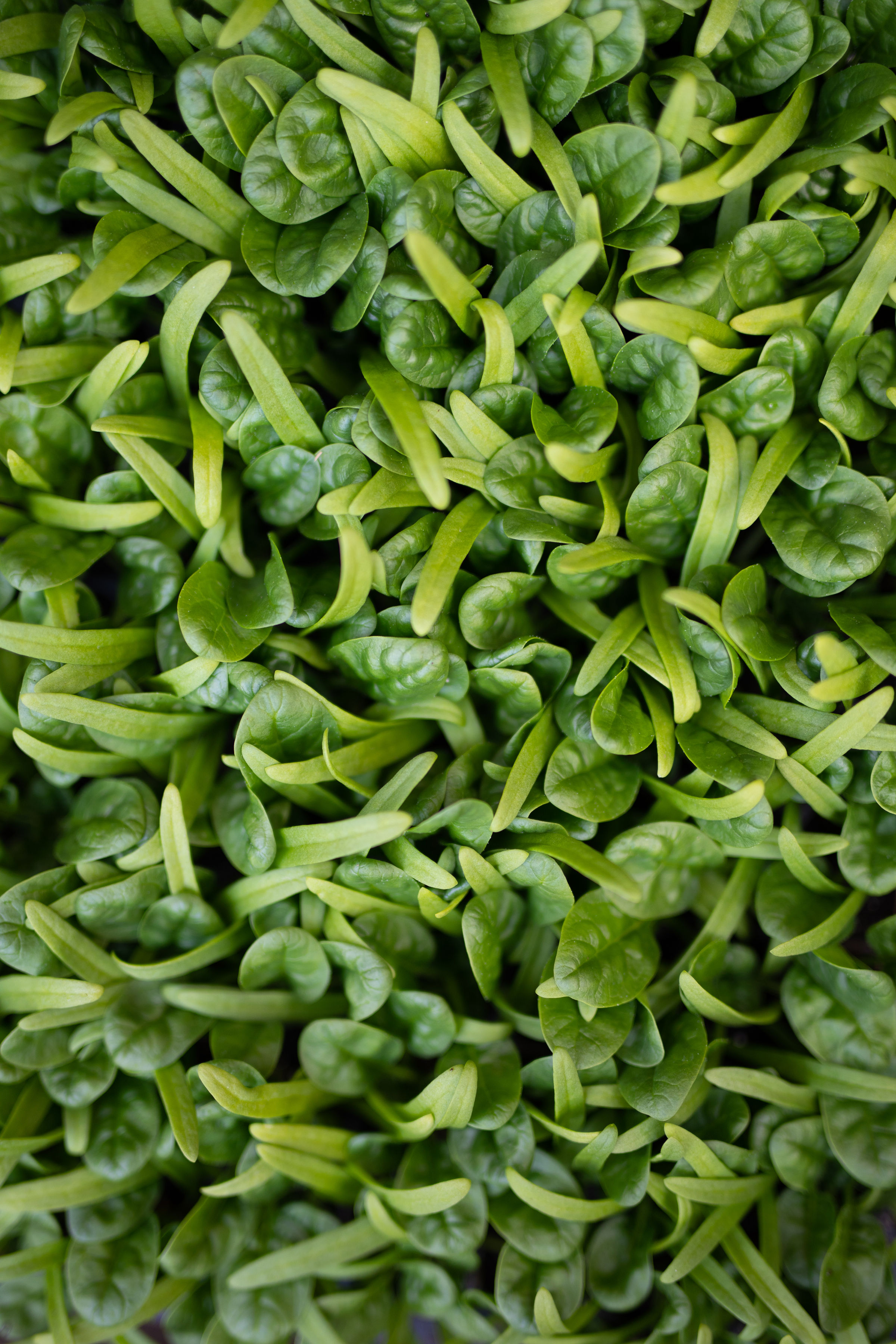 Our spinach, which was seeded 3 seeds per cell in 128 flats on March 1st was showing some signs of nitrogen deficiency. The pointy leaves that you see in the close-up on the far left are the cotyledons, the pre-formed leaves inside the seed casing that are first to emerge when the seed germinates. Their slight yellow coloration is an indication that they are deficient in nitrogen. We use an excellent point soil mix from Vermont Compost which almost always is sufficient for our seedlings until transplant, but there was a little bit of 2018 soil left in the soil bin when we started this year, that got mixed in with the first 2019 soil. The 2018 soil got rained on over the winter when the lid came off (we took the bin out of the greenhouse to make room for our winter CSA distribution). Rain leeches nitrogen from soil, which is what we think explains the deficiency.