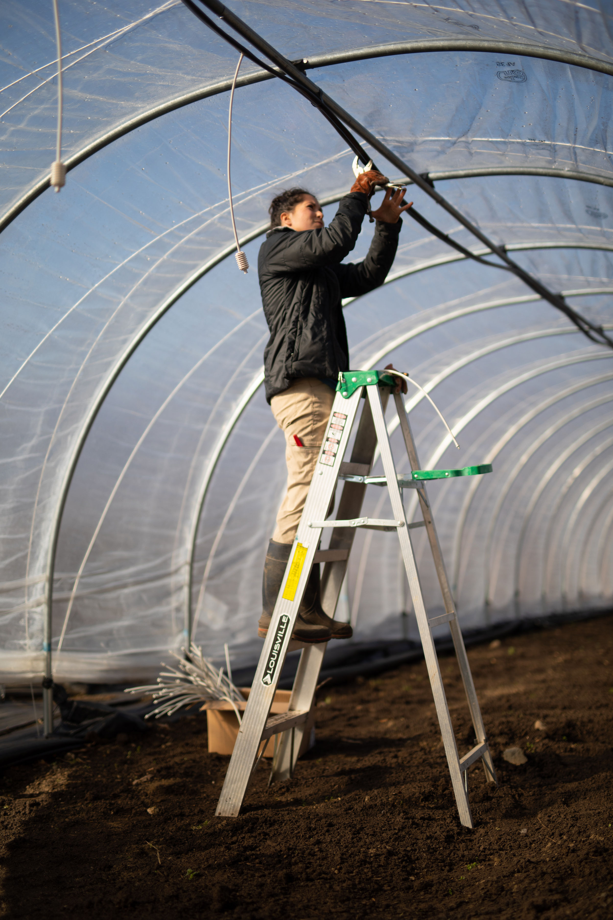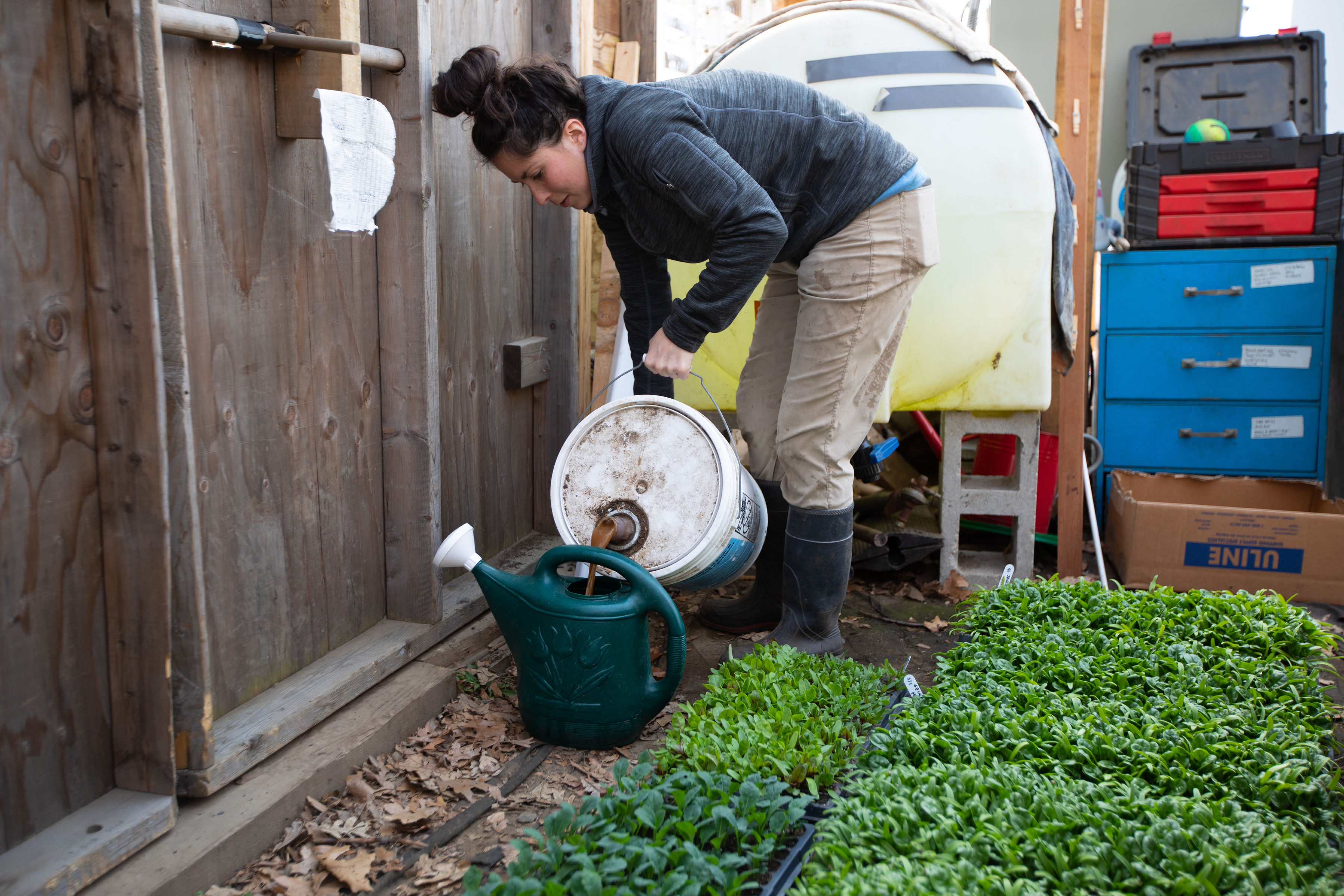 In any case, they are excellent transplants, despite showing a little hunger, and we gave them a ‘fishing’ for a little nutritional boost. Erin mixed just a tiny glug of fish emulsion (literally super ground up fish guts, the waste product of fish processing) with water and watered all our trays before we carried them on a handy plant stretcher to be planted in the tunnels. This liquid fertilizer is highly available to our plants, which is great for a small boost, but because of its availability it is not very stable, and is not a lasting source of nutrition (unless you keep applying).