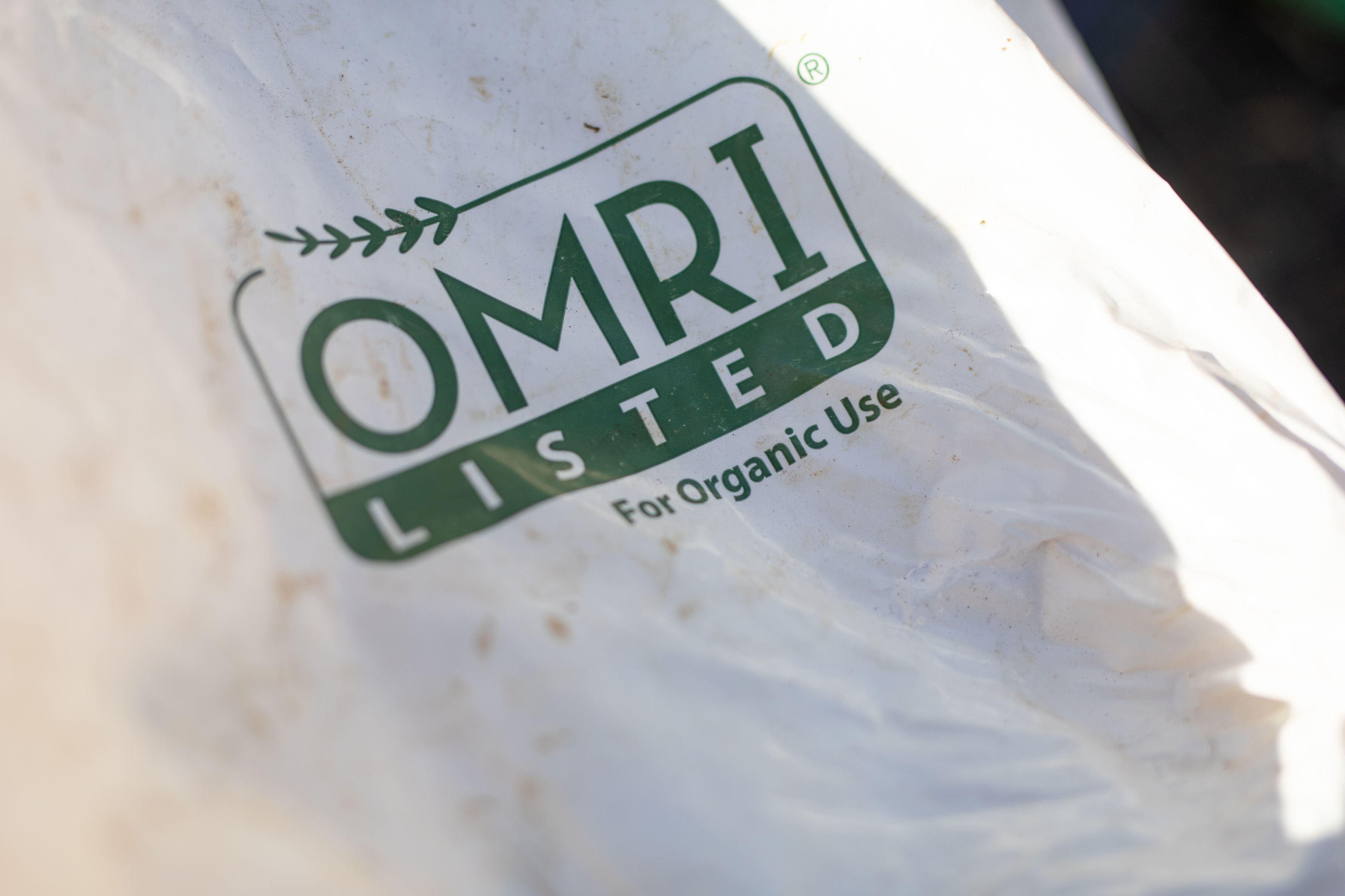 We shake the fertilizer on by hand. The label pictured above, from the fertilizer bag, is an important one to know. It means the product has been approved for organic use by the Organic Materials Review Institute. If you are someone who cares about organic gardening, this is a good website to check out and an important label to know.