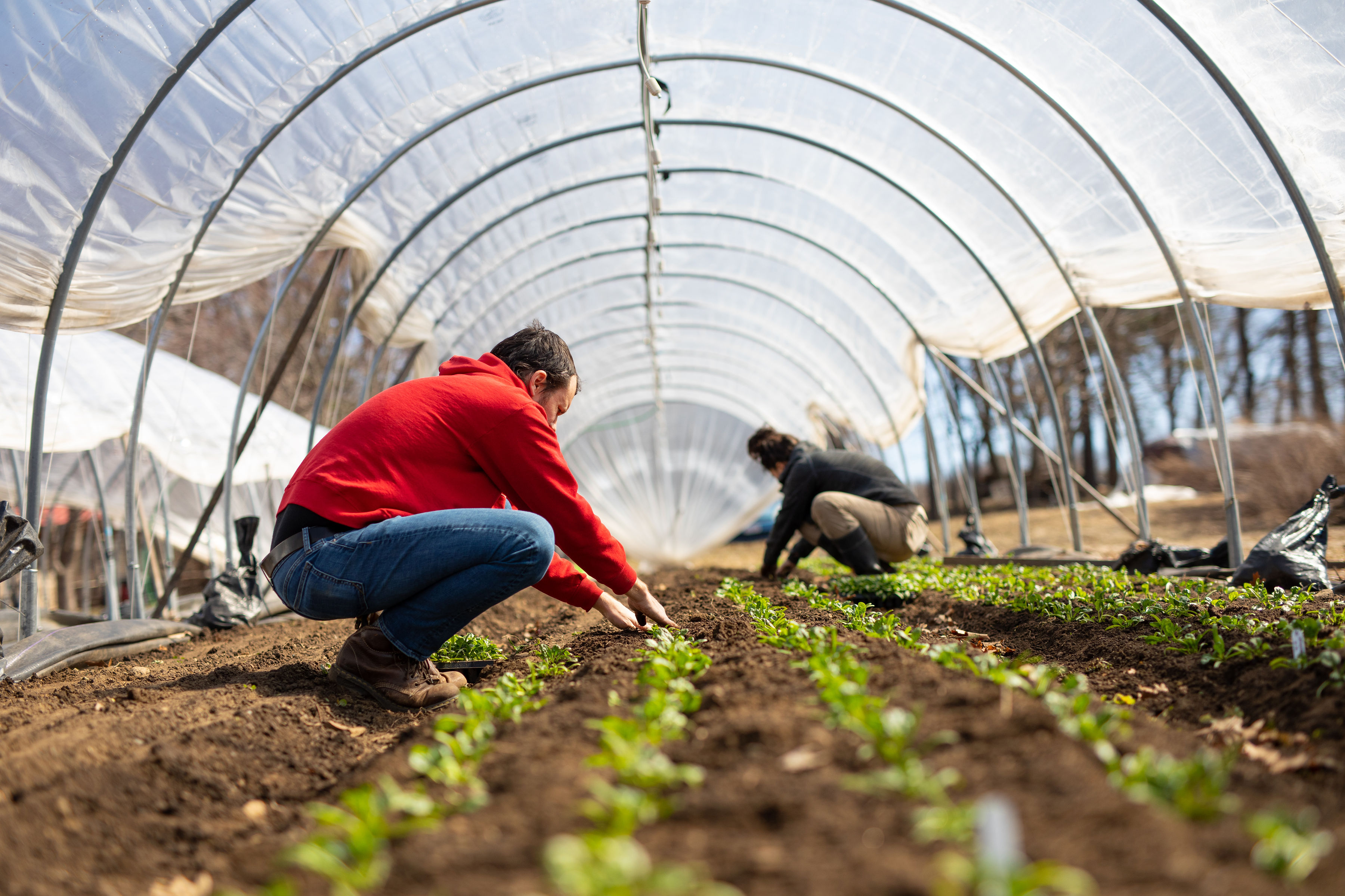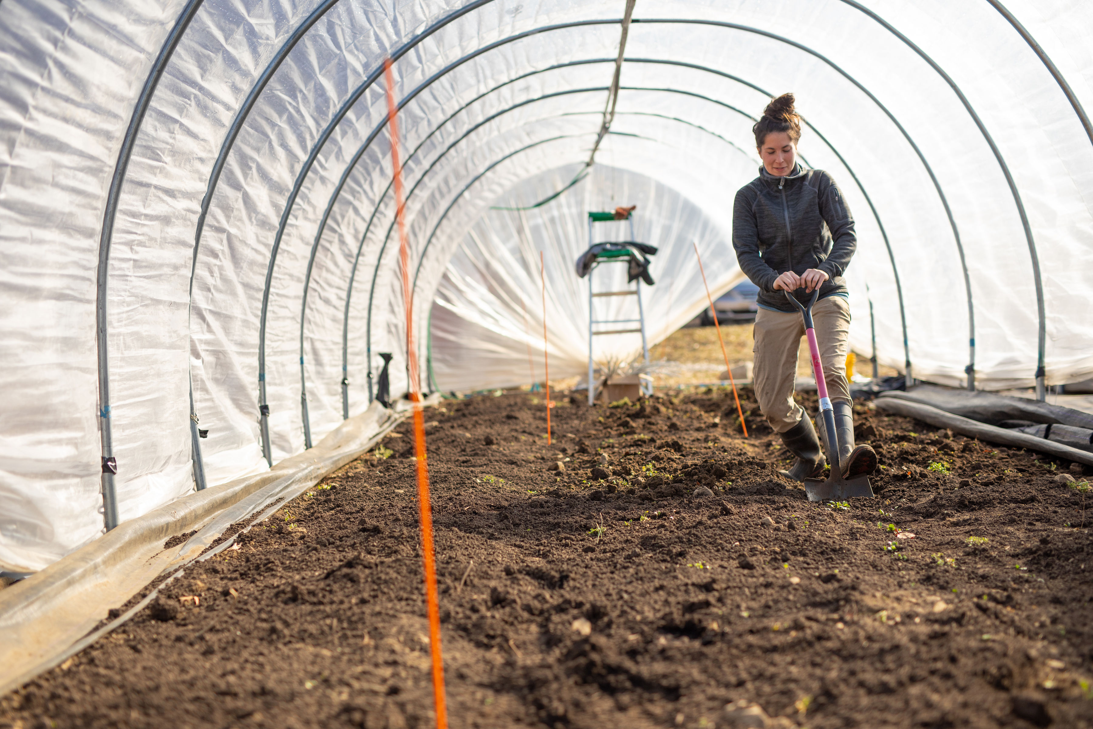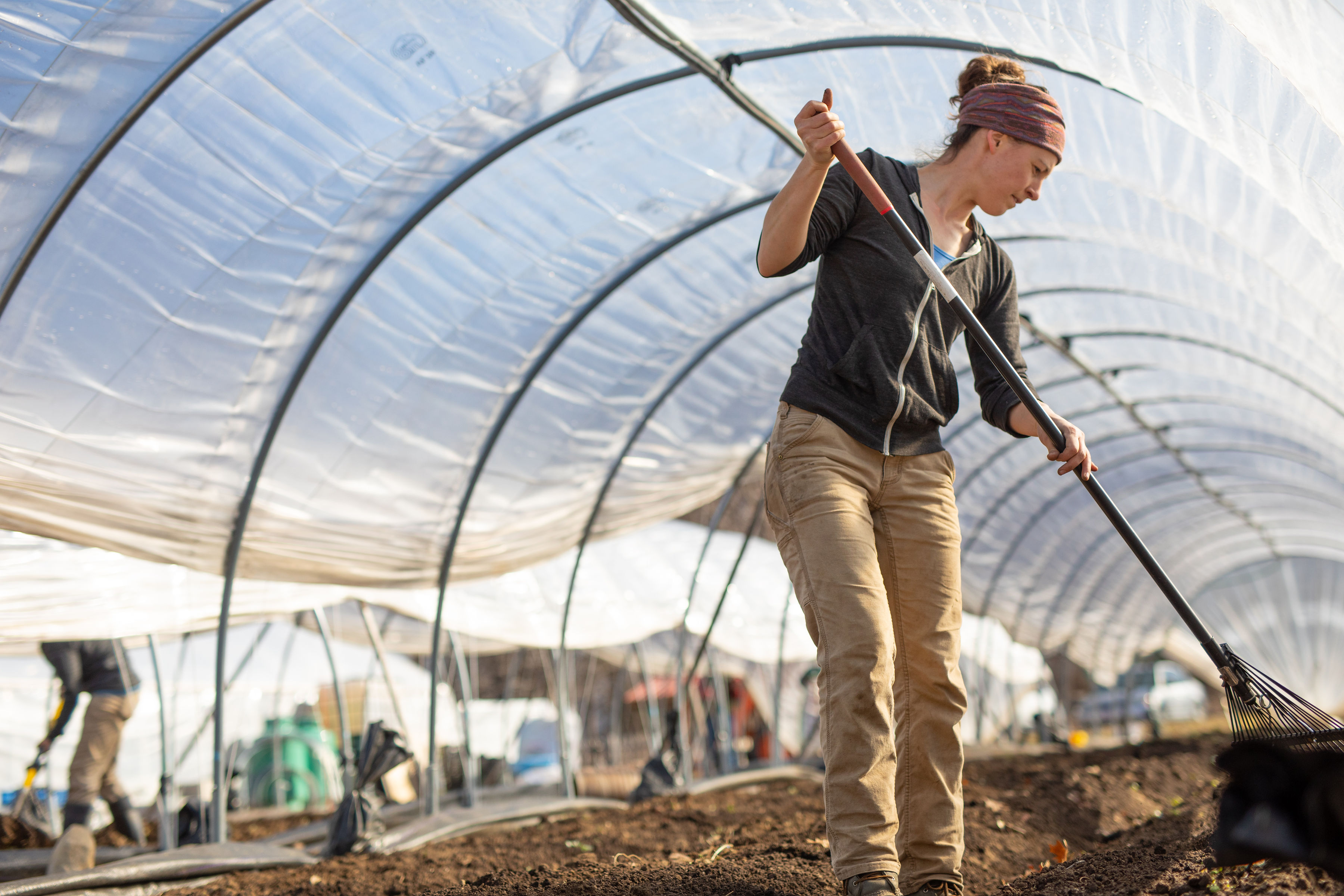 We then let the soil warm and dry before spreading compost (roughly 2 yards per house). We don’t use much compost on this land because there is very high phosphorus and potassium, so adding compost (a source of both) is not recommended. But, the tunnels produce so much food each year, we like to start with a healthy dose of compost both to add slow release nutrition and as a soil conditioner. Humus, which is fully decomposed organic matter, has a slightly negative charge and can hold water and other positively charged minerals like calcium and magnesium, increasing their availability to our crops. (We did the compost the day before we did the photo-shoot, and didn’t take pics, but you can imagine Erin and Kevin shoveling rich, dark, beautiful compost off the back of the big black truck.) We buy in from Weston Nurseries in Hopkinton – it’s certified organic and high quality.