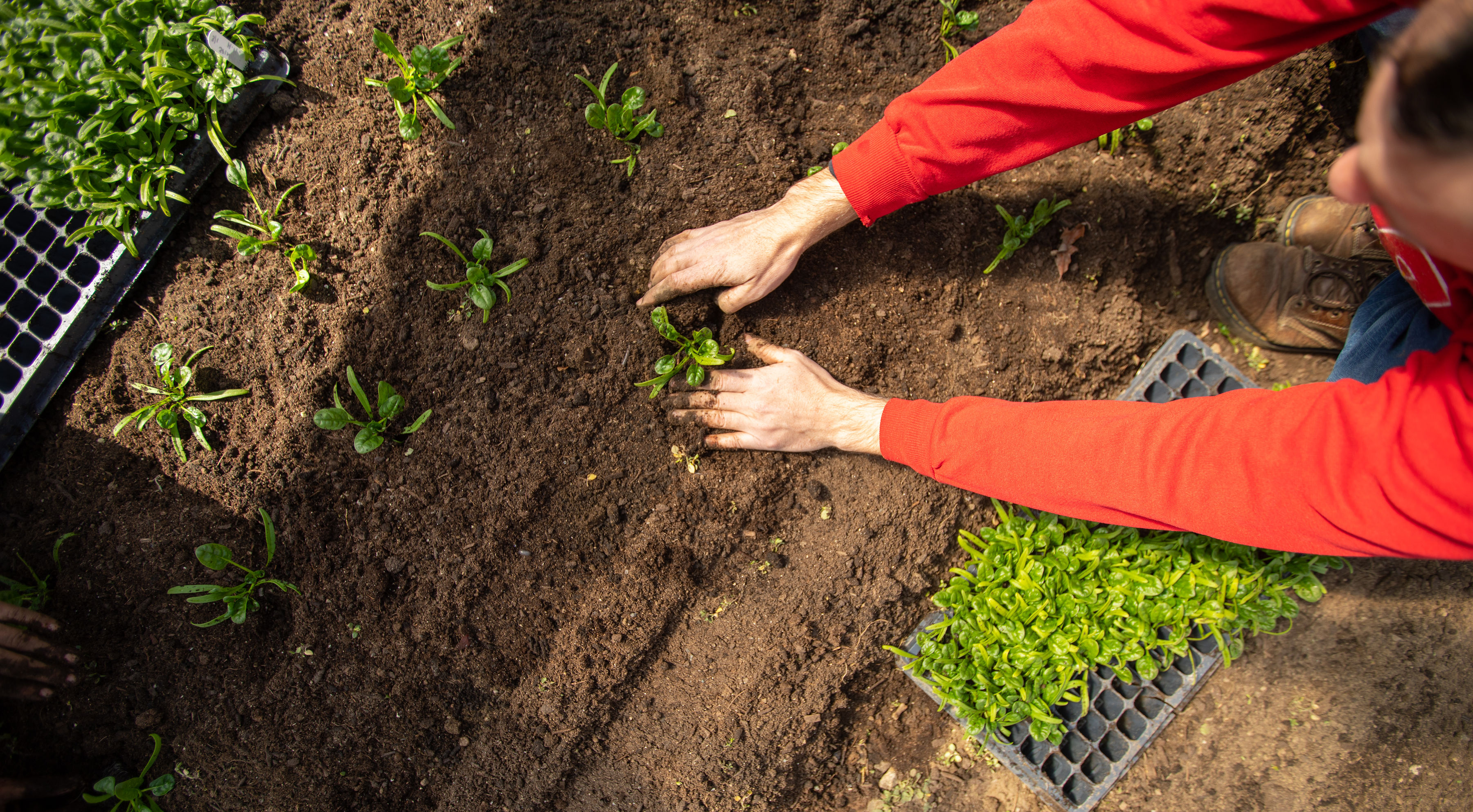 We plant the spinach plugs 6″ apart, 4 rows/bed. It took just under 12 flats to plant 3 beds. The other three beds were planted into: direct seeded french breakfast radish, direct seeded arugula, and one bed was half swiss chard transplants, half lascinato kale transplants. The soil is loose enough to plant just with our hands, but the trowels have markings that help us measure how far apart our seedlings are. They are planted in a grid pattern.