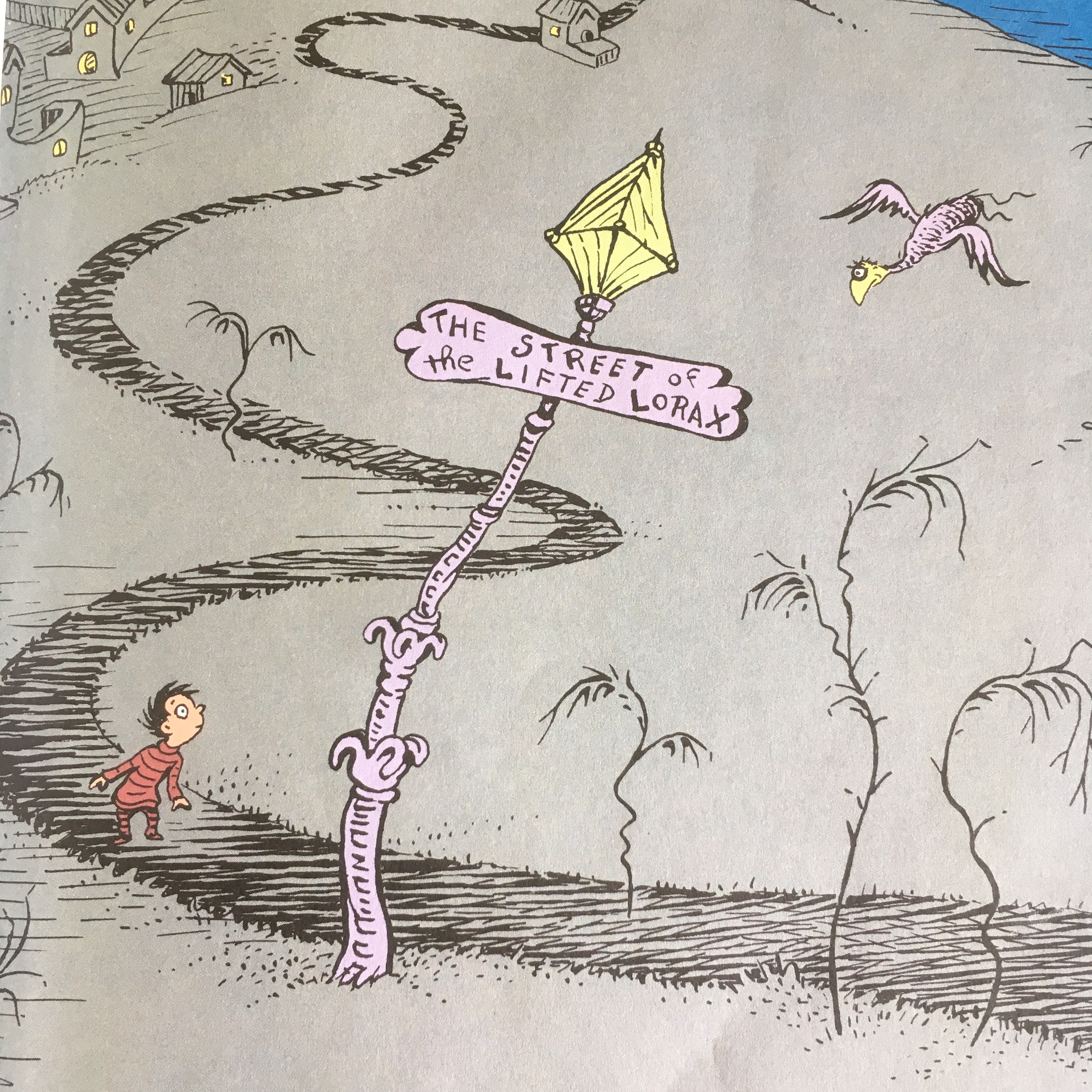 For those of you who haven’t read it in a while, or at all, here is my quick summary: a young boy wanders to the outskirts of town seeking the “Once-ler”, a hermit who lives in a decrepit old building. For a small fee, “15 cents and a nail and the shell of a great, great, great grandfather snail,” he pays the Once-ler to tell him the tale about the Lorax. The Once-ler starts by telling about himself, when he first came to the area, an enthusiastic entrepreneur, he arrived in the truffula tree forest, and started a business making “Thneeds” out of truffula tufts (“a thneeds a fine something that all people need”).