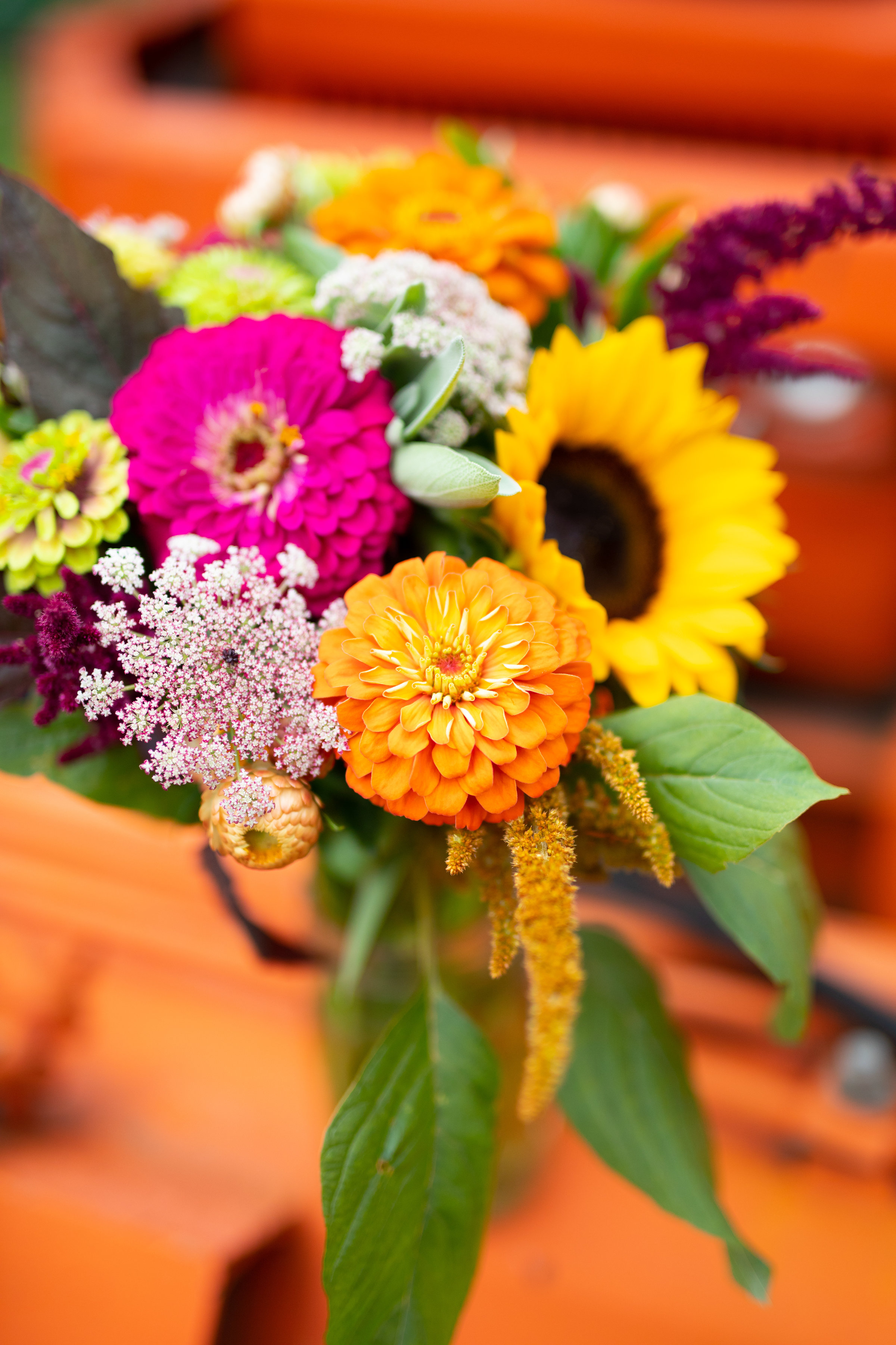 Arranged bouquets of a wide variety of summer annuals including: sunflowers, snap dragons, asters, dahlias, zinnias, lisianthus, celosia and so, so many more.